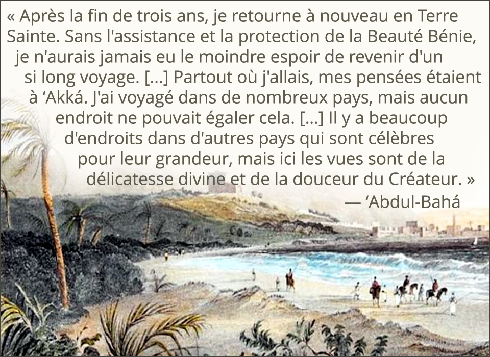 Épisode 9 2 novembre 2021 L'aliment essentiel dans la nuit la plus sombre « O vaisseau, qu'est-ce qui te fait osciller si gracieusement ? » — Bahíyyih Khanum, en voyant le navire d'Abdu’l-Bahá dans le port de Haïfa. ![]() Le Maître rentrait enfin à la maison. La communauté bahá’íe entière de la région était dans un tourbillon d'activité alors qu'elle se préparait avec enthousiasme à son retour, même si des rapports indiquaient qu'il était fragile et épuisé par son long voyage. Les membres de la maisonnée, supervisés par sa sœur, Bahíyyih Khanum, préparaient ses plats préférés avec enthousiasme, et de nouveaux vêtements pour le Maître étaient cachés de peur que s'il découvrait qu'il avait des surplus, il les donnerait. Le 5 décembre, le navire transportant le Maître est finalement apparu dans le port de Haïfa, ce qui a apporté une joie indescriptible à la famille, aux croyants et aux pèlerins en visite. 'Abdu’l-Bahá était si fatigué qu'après avoir embrassé la famille, il se rendit directement dans sa chambre pour se reposer un peu, mais revint bientôt et s'adressa à ceux qui étaient réunis : « Après la fin de trois ans, je retourne à nouveau en Terre Sainte. Sans l'assistance et la protection de la Beauté Bénie, je n'aurais jamais eu le moindre espoir de revenir d'un si long voyage. […] Partout où j'allais, mes pensées étaient à ‘Akká. J'ai voyagé dans de nombreux pays, mais aucun endroit ne pouvait égaler cela. […] Il y a beaucoup d'endroits dans d'autres pays qui sont célèbres pour leur grandeur, mais ici les vues sont de la délicatesse divine et de la douceur du Créateur. » 'Abdu'l-Bahá et son épouse Munírih Khanum firent plus tard un voyage en Galilée et aux sources chaudes de Tibériade pour un rajeunissement bien nécessaire. Ils sont restés un mois, et bien qu'il n'y ait pas eu beaucoup de monde au début, il n'a pas fallu longtemps pour que des foules de gens viennent rendre visite au Maître. Il a également visité Adasiyyih, une communauté agricole près de la vallée du Jourdain dont il avait acheté la terre au début du 20ième siècle, près de l'endroit où le Christ avait autrefois nourri la multitude avec du pain et du poisson. A leur retour, le Maître dit à la maison d'accueil : « C'est un lieu de réclusion et de contemplation. C'est un endroit sanctifié par la présence de Sa Sainteté le Christ. Souvent, il marchait le long du rivage de la mer de Galilée, et pendant sa marche, il instruisait ses disciples. Alors que je marchais sur le rivage, ces actes immortels ont été ramenés à ma mémoire. » La paix et la tranquillité de la maison n'ont cependant pas duré. Le 28 juin 1914, l'archiduc Ferdinand d'Autriche et son épouse furent assassinés à Sarajevo, en Bosnie. Dès le lendemain, 'Abdu’l-Bahá envoya tous les pèlerins occidentaux et quelques bahá'is iraniens chez eux pour leur sécurité, et un mois plus tard, la première guerre mondiale commença pour de bon. En août 1914, le Maître a accepté une invitation de Shaykh Salih, le